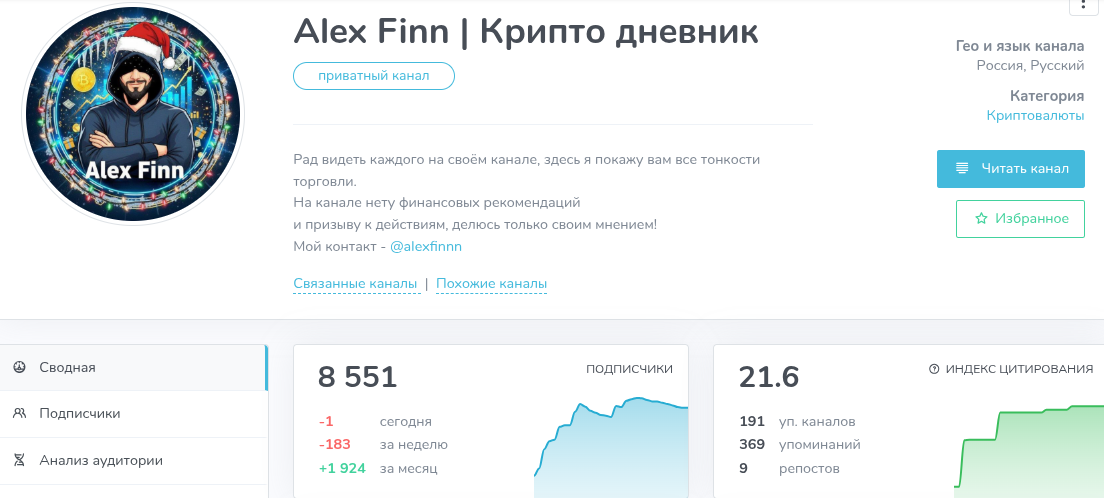 Подписчиков у телеграм-канала «Alex Finn Крипто Дневник» свыше 8500 человек, что на первый взгляд может показаться значительным количеством. Однако даже простой анализ показал несостыковку объема аудитории с реальным потенциалом.