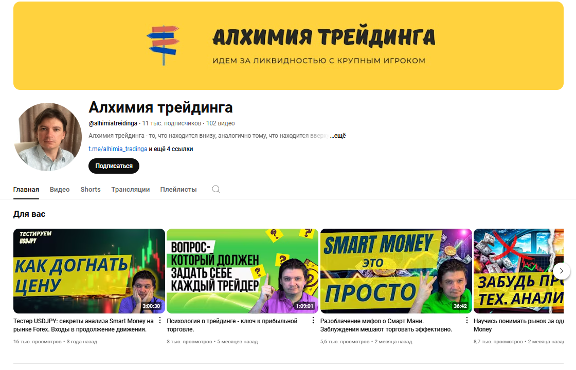 Роман активно начал размещать материалы со своими торговыми принципами в Ютуб канале. На момент написания обзора на автора подписано 11 тысяч человек, ролики набирают по 5-10 тысяч просмотров. Все видео Алхимии Трейдинга дублируются в другие социальные сети: