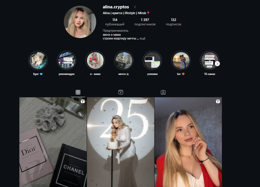 Алина является молодой мамой, которая продвигает трейдинг и инвестиции в криптовалюту – вероятно, ее основная аудитория, это женщины в декрете, ищущие способы заработка из дома.