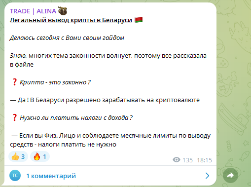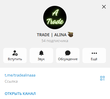 В описании профиля представлена ссылка на телеграмм-канал @tradealinaaa, в рамках которого Алина рассказывает о трейдинге и вложениях в криптовалюту. На этот ресурс подписано всего 54 человека, но его забросили, так как в ленте не появляется новых публикаций с июня 2025 года.