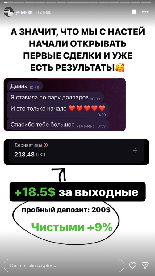 В социальных сетях Алины можно найти скрины с положительными отзывами от учеников, но их трудно принимать во внимание. Нередко инвесторы создают поддельные скриншоты, чтобы втереться в доверие к потенциальным клиентам.