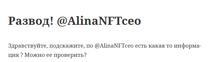 В сети была обнаружена жалоба на AlinaNFTceo, в которой пользователи рассказали о своих сомнениях по поводу этого аккаунта. Вероятно, Алина предлагала человеку сотрудничество, но он решил вначале найти о ней информацию.