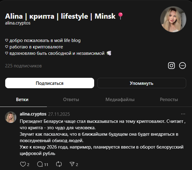 Чтобы предотвратить возможный обман, мы провели небольшое расследование, в результате которого наткнулись на аккаунт инвестора в X. Там Алина ведет блог, рассказывая о своем образе жизни и инвестициях в криптовалюту, у нее всего 255 подписчиков.