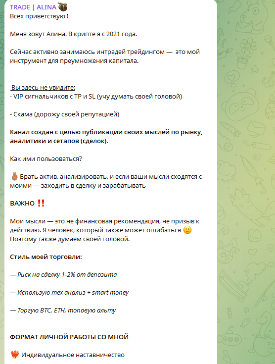 При этом AlinaNFTceo предлагает индивидуальное наставничество, но публично не озвучивает стоимость своих услуг. Она рассказывает, что рискует только на 1-2% от депозита и использует технический анализ для торговли, но все это выглядит как способ привлечения внимания, а это вряд ли принесет пользу на практике.