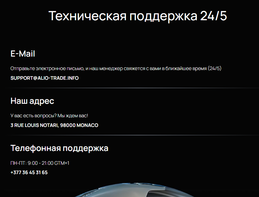 Alio info trade занимается обработкой платежных сделок клиентов. В документах на сайте нет информации о регистрации юридического лица. В контактах мы обнаружили адрес офиса компании.