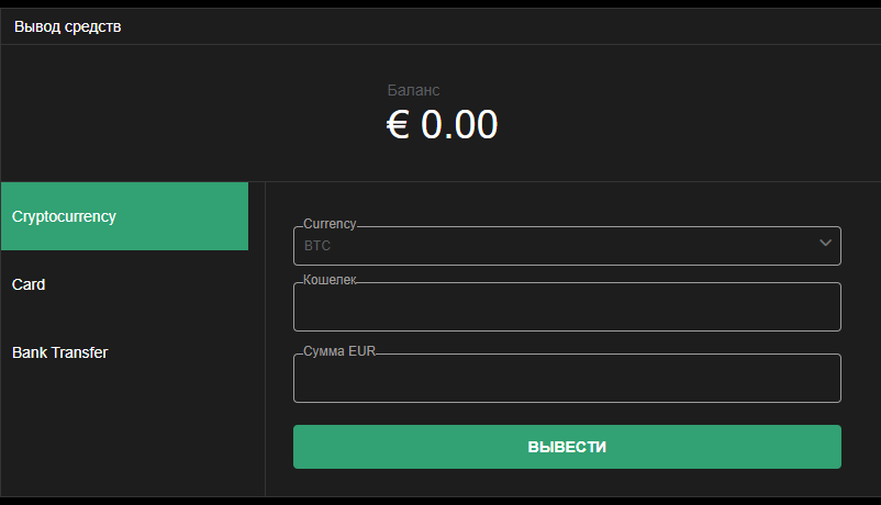 Выводить деньги можно в криптовалюте, на карту или банковским переводом.
