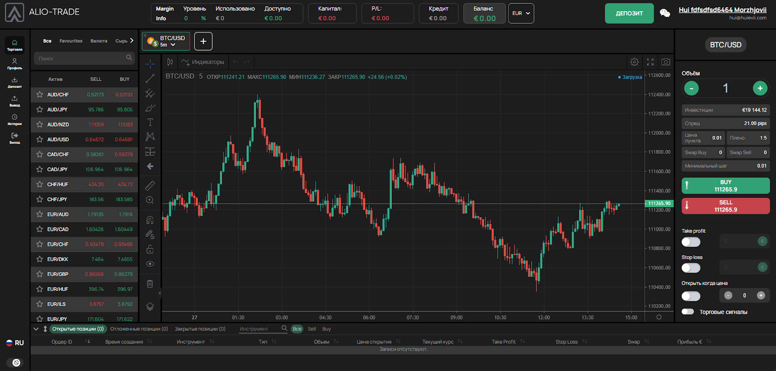 После регистрации пользователь попадает на сайт trade alio info ink. На главной странице размещен график, отображающий рост курсов валют. В левой части находится меню для управления балансом.