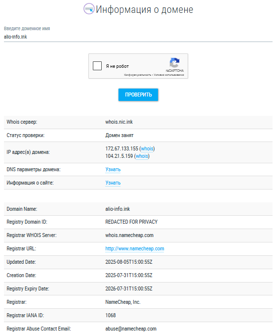 Сайт alio-info ink переведен на несколько языков, в том числе и на русский. Домен зарегистрировали в июле 2025 года, на момент подготовки обзора адресу около месяца.