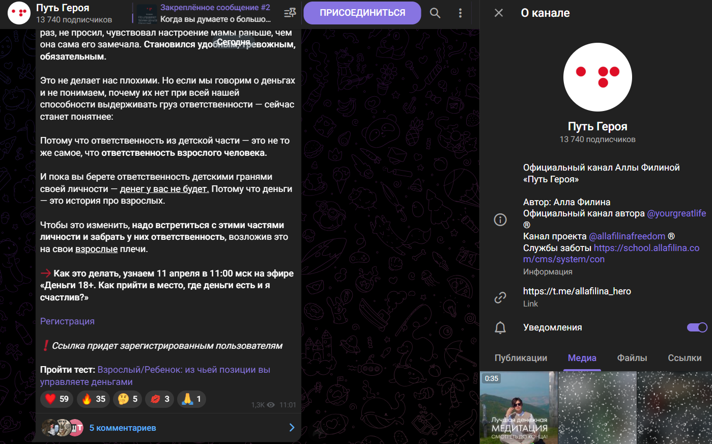 Обзор канала про деньги в Телеграм «Путь Героя» Аллы Филиной: отзывы реальных подписчиков на разборы по инвестированию, анализ профессиональной деятельности и биография AllaFilina