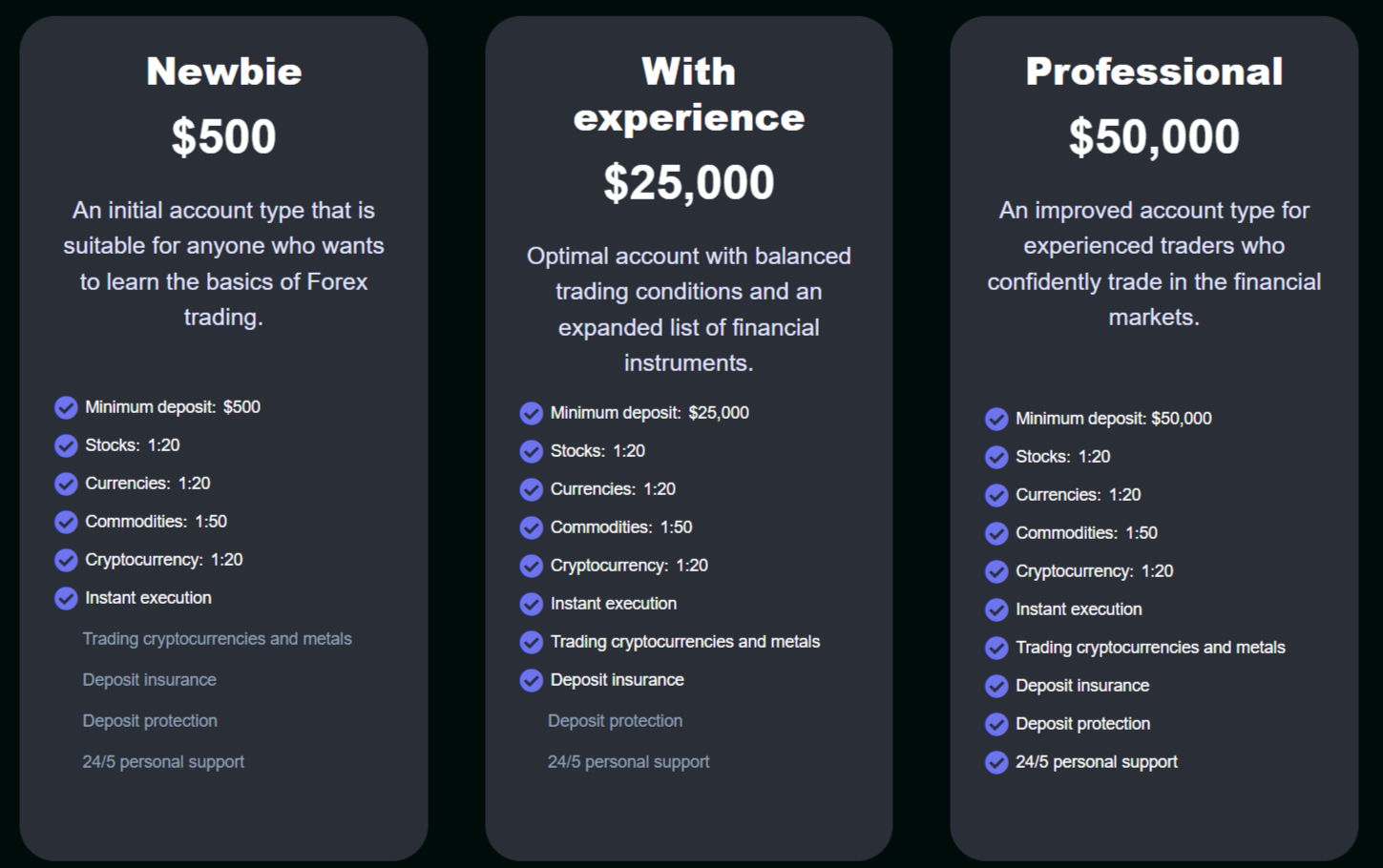 - Professional предполагает депозит от 50 000 USD. Добавляется личная поддержка менеджера.