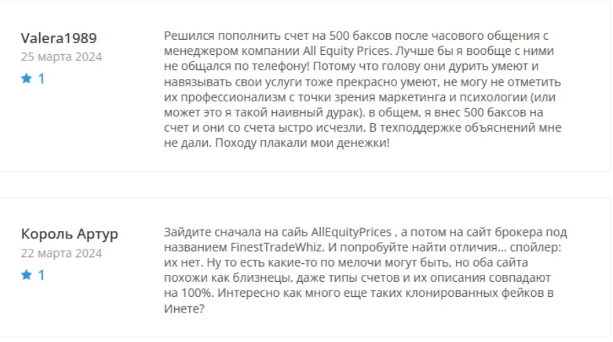 Пользователи жалуются на манипуляции с торговыми счетами, невозможность вывода средств и отсутствие реальной поддержки. Часто после пополнения счета на allequityprices net брокер блокирует аккаунты. Чтобы возобновить доступ к счету нужны дополнительные платежи. Кроме того, команда проекта ссылается на несуществующие комиссии или налоги.