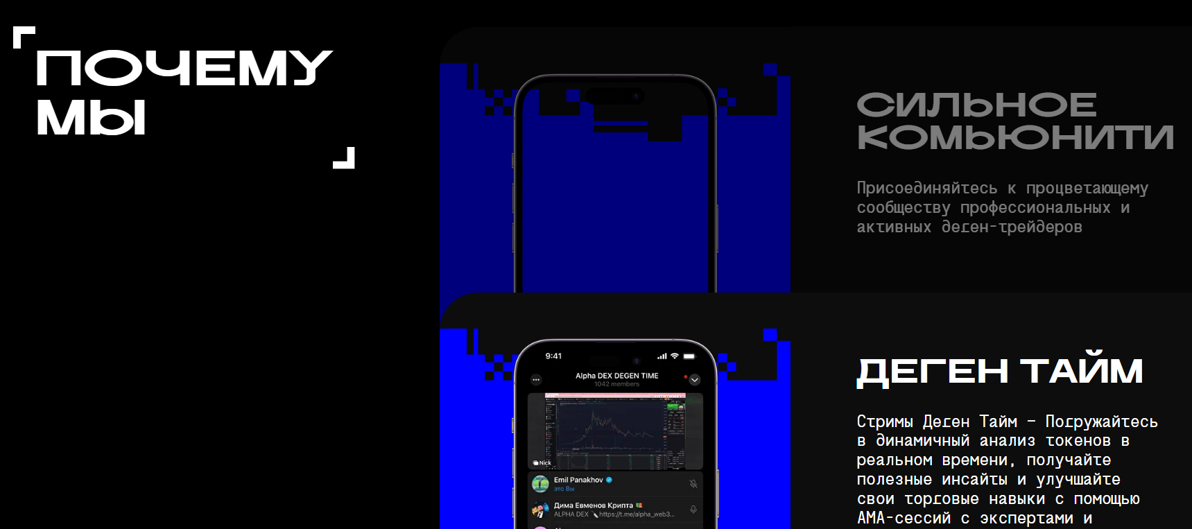 Биржа Alpha dex обещает пользователям сплоченное сообщество, в котором можно получить помощь. Тут обещают периодическое проведение стримов с полезной для трейдеров информацией. В описании проекта много странных и мало что означающих фраз. Утверждается, что биржа всегда находится на шаг впереди рынка, также тут утверждается о реализации в технологиях торгового опыта. Помимо этого, предлагают использование специального альфа-ордера, который сам находит лучшие сделки по выгодным ценам. В итоге, у пользователя меньше времени тратится на ручной контроль.