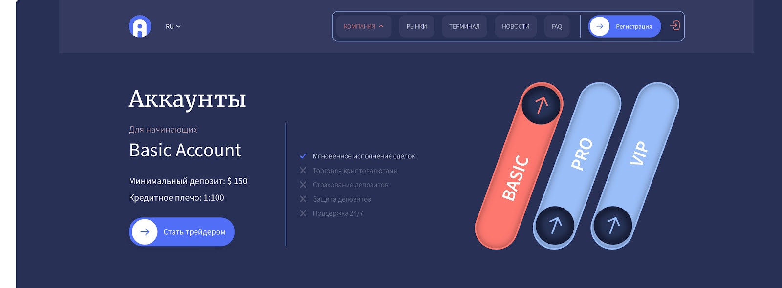 • Basic. Минимальный вклад – $150, доступно кредитное плечо размером 1:100. Из преимуществ только мгновенное исполнение ордеров;