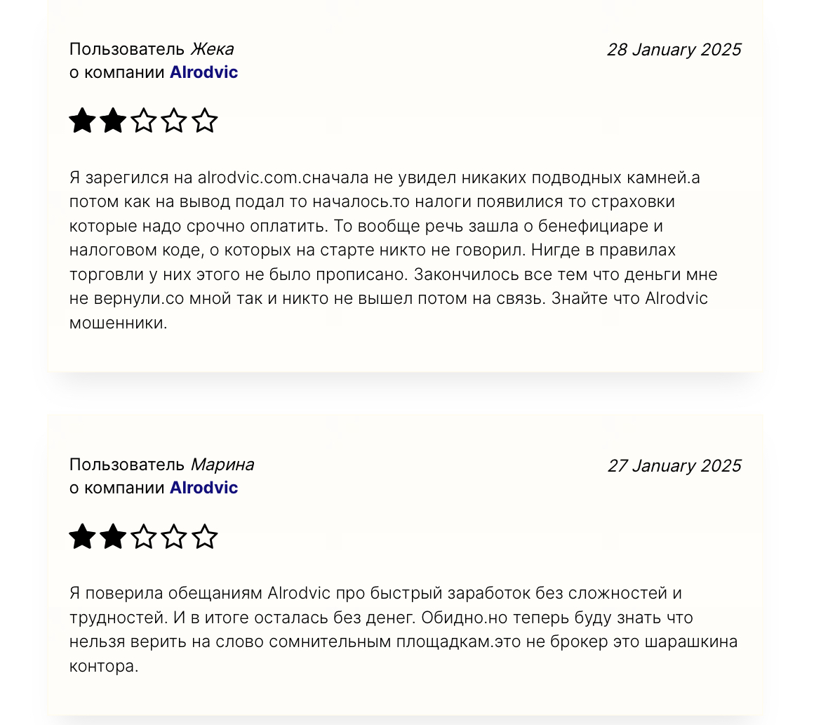 • Отрицательные отзывы Alrod vic создают негативное впечатление о проекте. Это может оттолкнуть ряд пользователей от сотрудничества с площадкой.