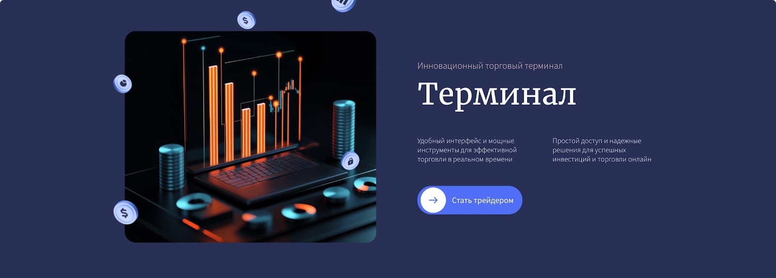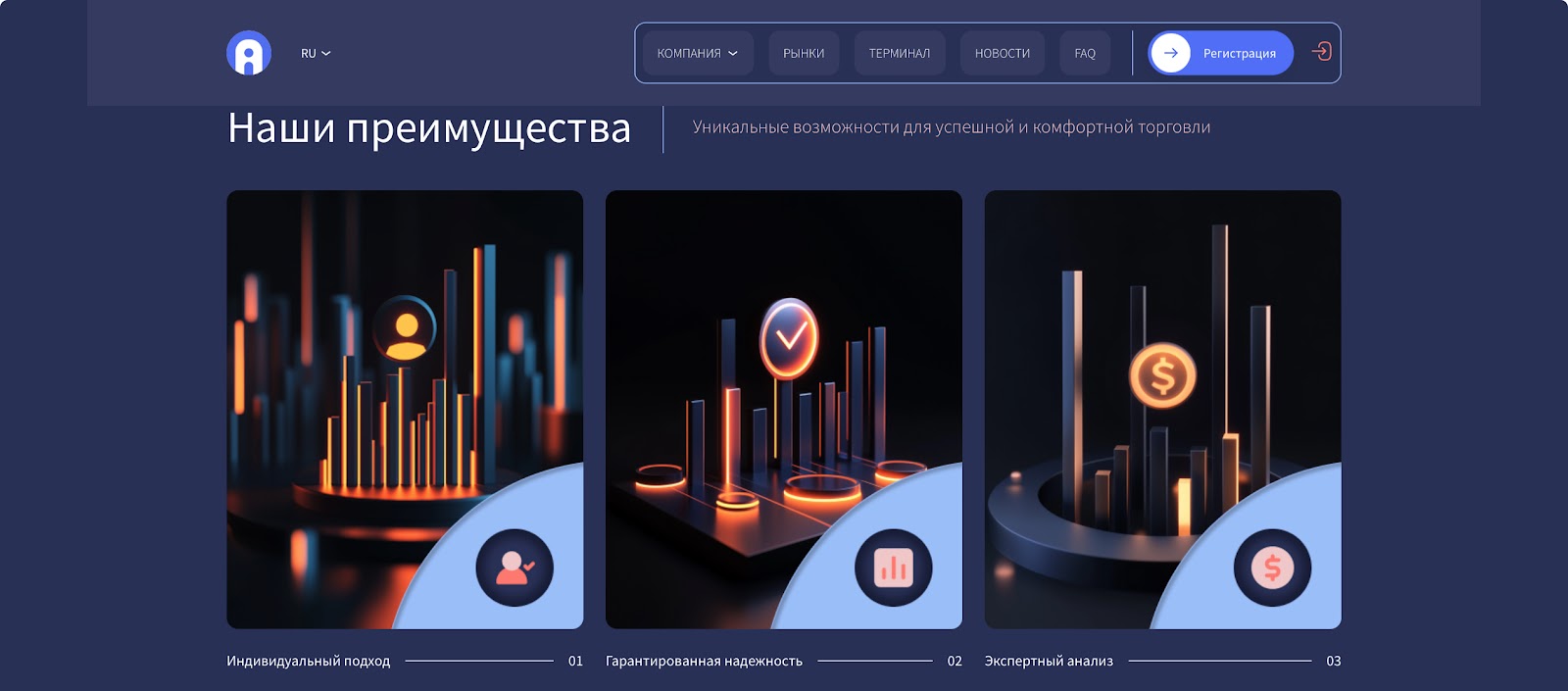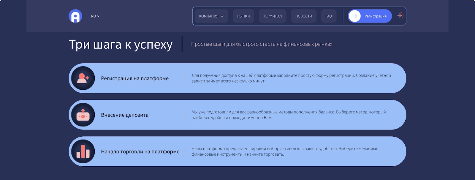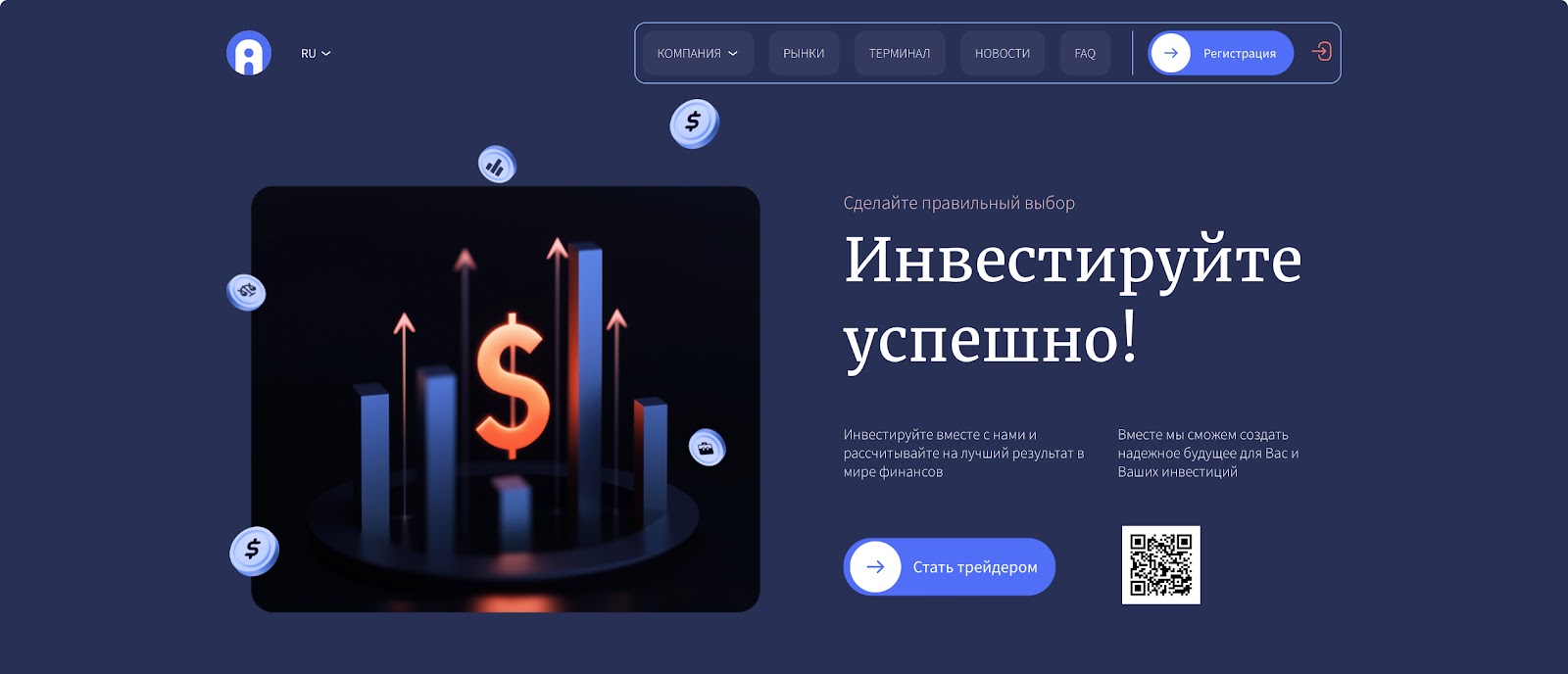 Официальный сайт брокера приветствует клиентов слоганом «Инвестируйте успешно!». Они обещают лучшие результаты от торговли. Как заявлено на главной странице, компания построит надежное будущее для инвестиций своих пользователей.