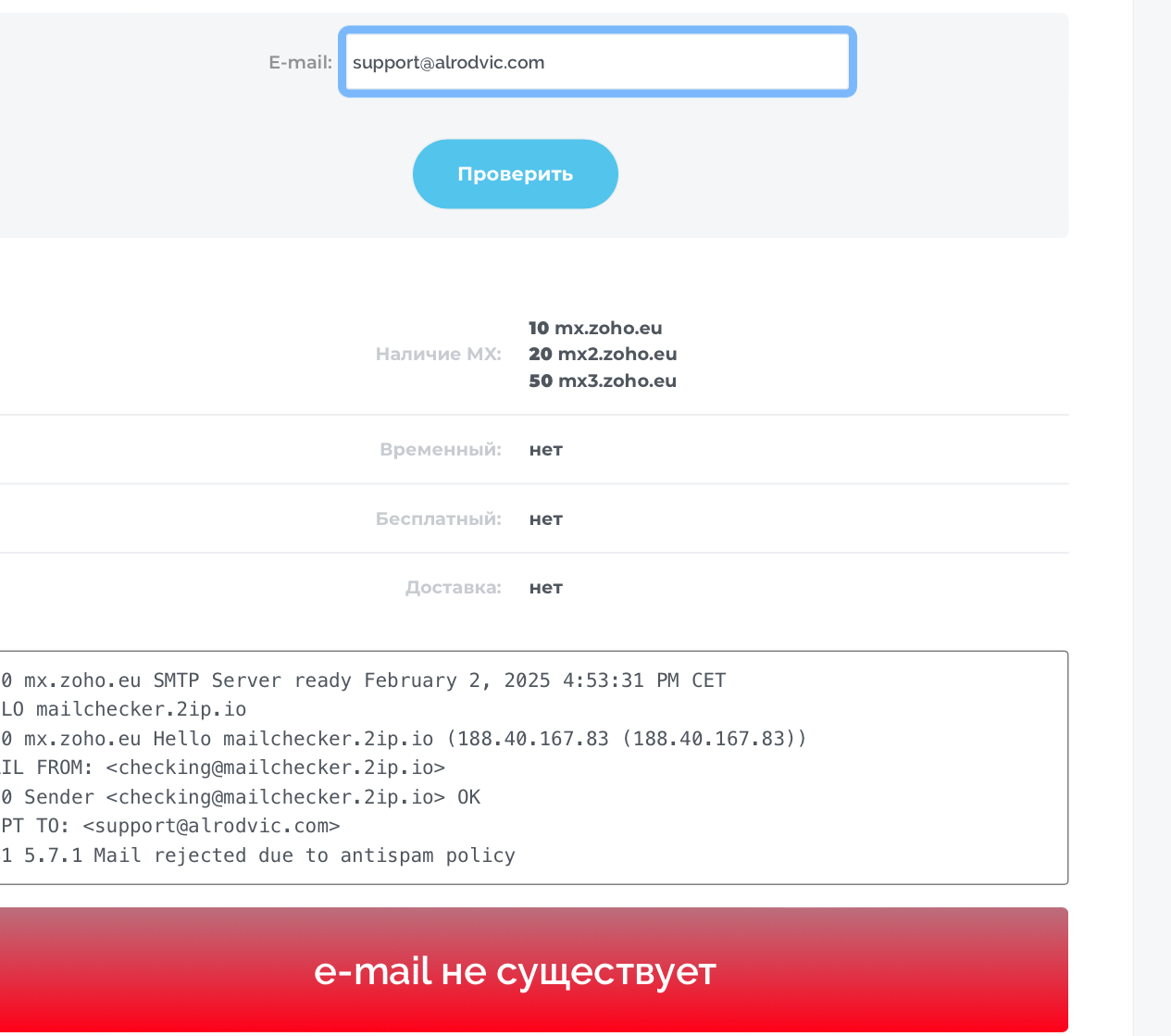 Мы проверили имейл support alrodvic com на сервисе 2IP. Как выяснилось, такого адреса на самом деле нет. Это значит, что клиенты не смогут получить фидбек в случае ошибки или разногласий.