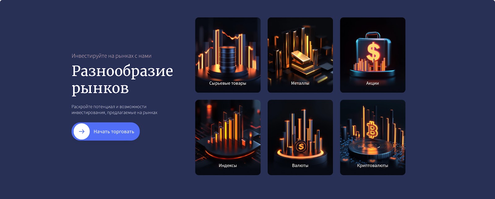 Разработчики подчеркивают разнообразие рынков, однако приводят стандартный список, характерный для большинства торговых платформ. Для трейдинга доступно: