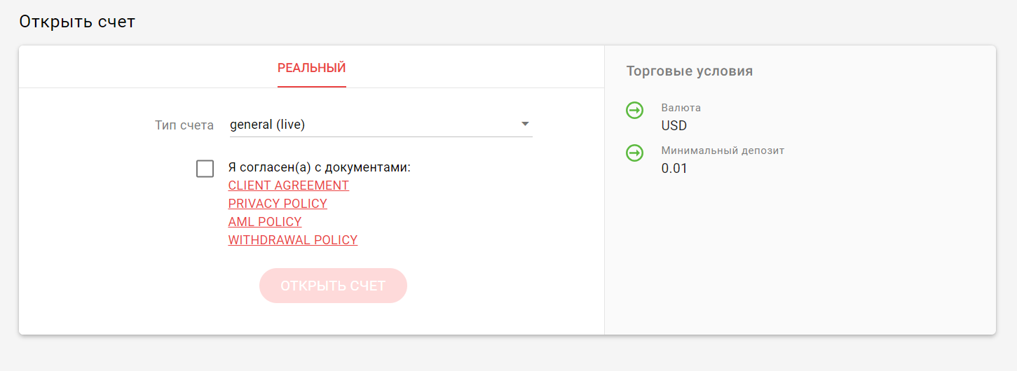 Для начала работы и ознакомления с документами компании потребуется ввести свои данные. Приложения у брокера нет, поэтому пользоваться сервисами можно только через web-версию. В интерфейсе присутствует русский язык, что может порадовать русскоговорящих трейдеров.