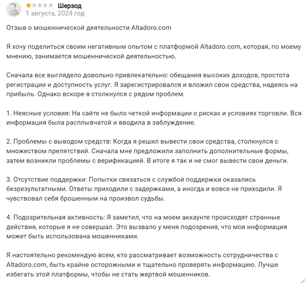 Отзывы на Altadoro в Сети присутствуют в очень скудном количестве. Все они имеют отрицательный характер. Пользователи жалуются на обслуживание, отсутствие поддержки и подробно рассказывают о своем опыте работы с якобы надежным брокером.