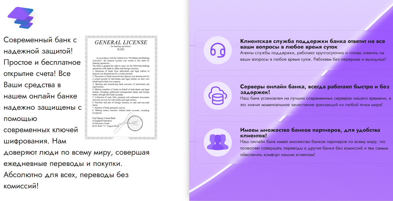 - Ничем не подтвержденные данные о том что организация является крупнейшим банком в мире, что может ввести пользователей в заблуждение.
