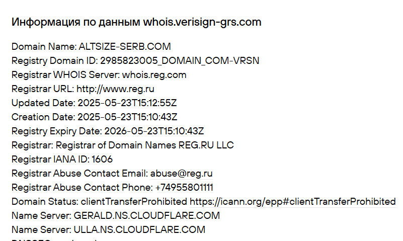 Проверяем домен через сервис Whois и видим, что создан сайт был лишь 23 мая 2025 года.