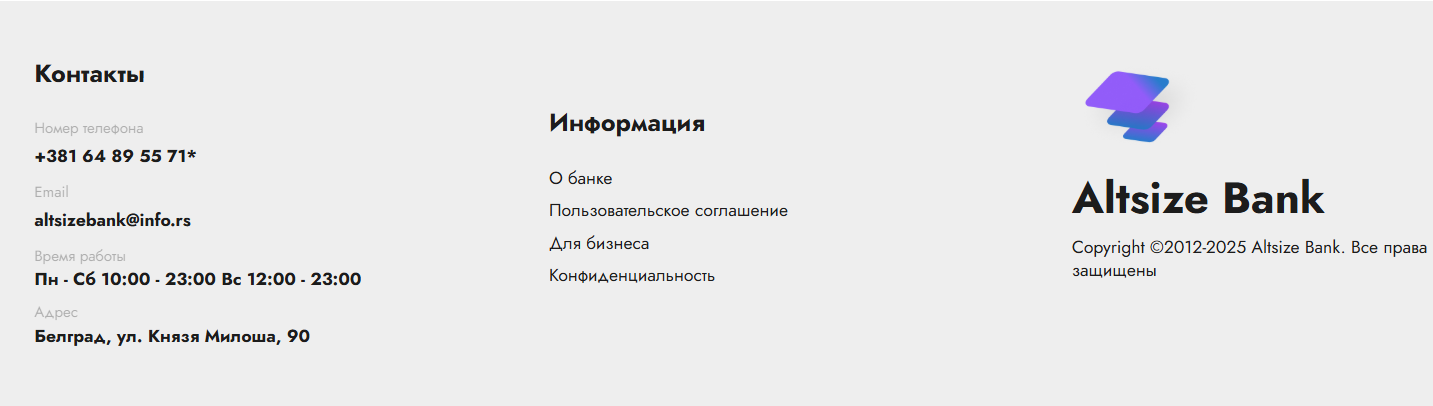 Это далеко не 2012, как указано в футере самого ресурса «Альтсайз Банк». Здесь же видим краткие данные о контактах: