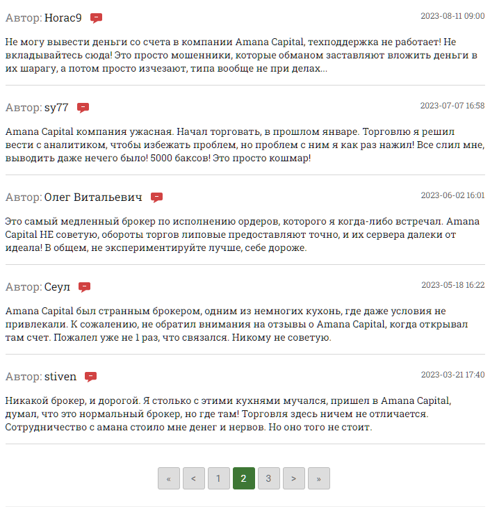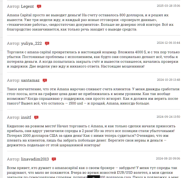 Это подтверждают отрицательные отзывы пользователей из РФ, которые рискнули торговать на платформе брокера «Амана».