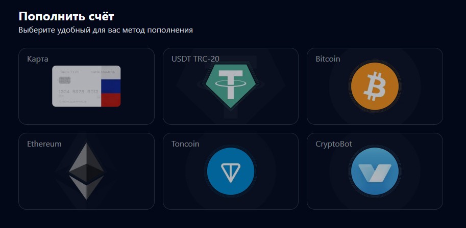 Пополнить счет можно с российской банковской карты, а также несколькими видами криптовалют.