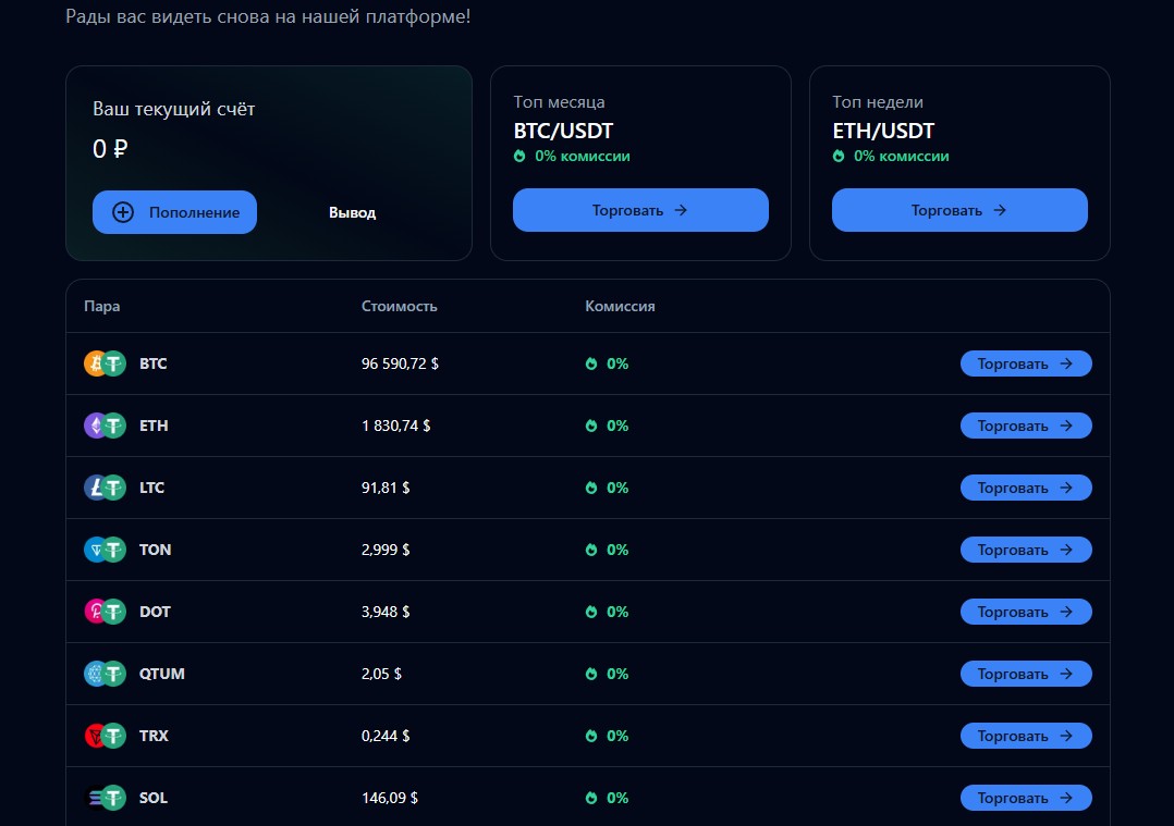 После регистрации на бирже Amberget пользователь попадает в профиль, где можно ознакомиться со списком криптовалют и начать торговать.