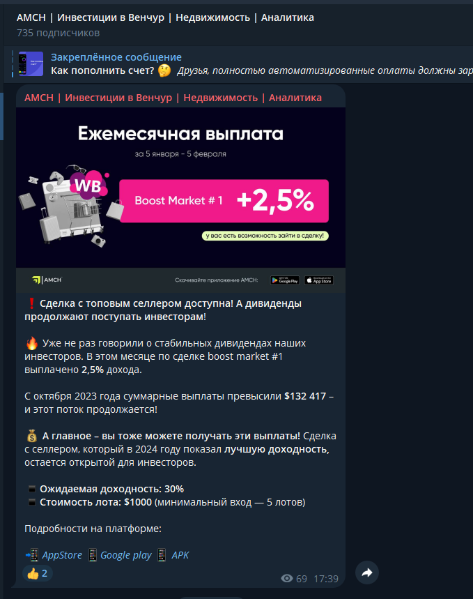 Социальные сети площадки не создают впечатление серьезного проекта, даже наоборот. Например, в телеграм-канале Amch Инвестиции в Венчур Недвижимость Аналитика всего около 700 подписчиков, а записи смотрят не более 100 человек. Это говорит об очень незначительной клиентской базе, с которой инвестиционная компания как будто даже не сможет нормально работать.