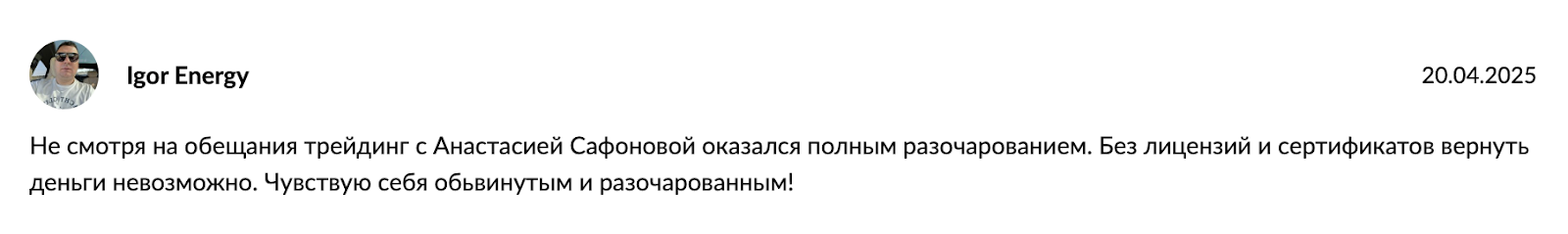 Деятельность трейдера Анастасии Сафоновой выглядит довольно спорно. Формат работы, структура и подача сигналов вызывает сомнения в реальной эффективности и прозрачности работы. Для получения торговых идей и аналитики лучше рассматривать более проверенные и профессиональные источники. К тому же есть причины, вызывающие недоверие к каналу: