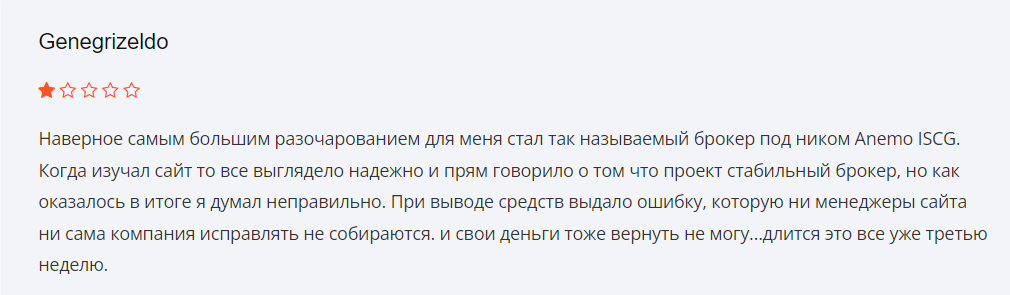Проект Anemo Iscg отзывы имеет разные и, учитывая, что на сайте их нет, то приходится искать отклики от реальных клиентов в сети. В интернете пользователи преимущественно оставляют негативную обратную связь о самом брокере и своём опыте сотрудничества с ним.
