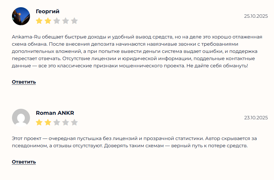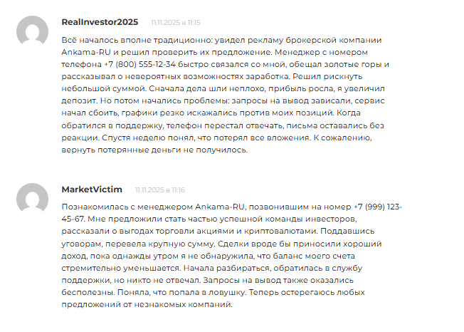 Другой участник рассказывает, что увидел рекламу Ankama ru и решил проверить предложение. Он связался с менеджером по номеру телефона. Сотрудник обещал высокую прибыль и возможности заработка. Пользователь внес 50 тысяч рублей, после чего баланс якобы вырос до 100 тысяч. Однако при попытке вывода запрос завис.