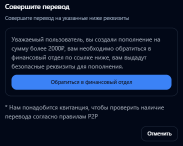 В правой части расположена панель для открытия позиций. Спреды, комиссии и размер плеча не отображаются. Трейдер видит только текущую цену и собственный баланс. Пополнение возможно двумя способами. Первый – перевод на российские банковские карты. После выбора суммы система выдает сообщение, что автоматическая обработка недоступна, и предлагает обратиться к менеджеру за реквизитами.