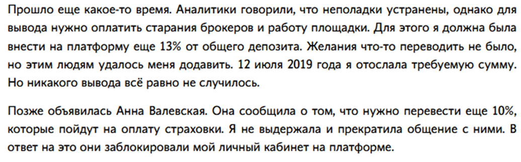 Основными путями взаимодействия Анны с клиентами брокера была переписка в мессенджере и холодные звонки. После того, как у трейдеров возникали проблемы с выводами депозитов, с ними связывалась Валевская для решения вопроса. Она говорила, что может ускорить вывод, но требуется страховой взнос в размере от 10-13%.