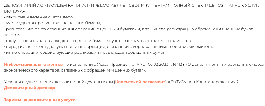Разработчики инвестиционной компании на сайте указали спецификацию платформы. Владельцы «Туоушен капитал» пишут, что биржа — лицензированный профессиональный участник рынка ценных бумаг. Помимо посредничества при покупке и продаже акций, брокер предлагает брокерские, дилерские и депозитарные услуги — их детально разберем позже.