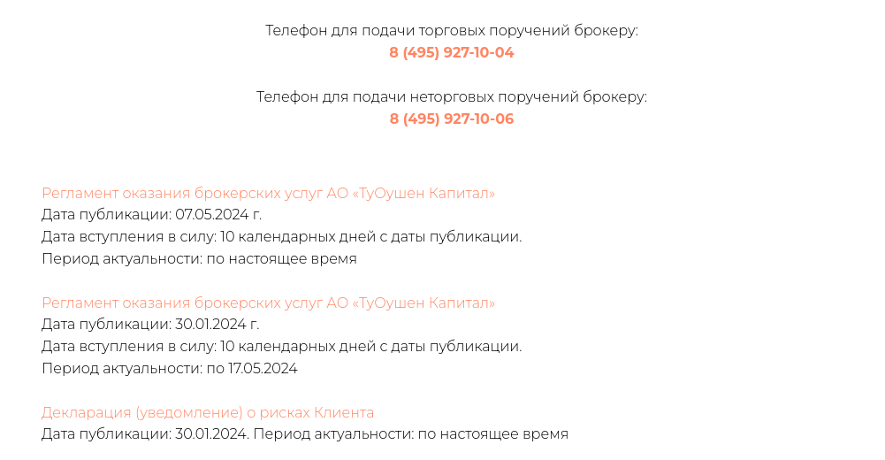 Инвестиционный сервис работает с институциональными квалифицированными клиентами. Для пользователей, которые подтвердили специализацию, доступны 3 вида инструментов. Чтобы заказать брокерское обслуживание у АО «Ту Оушен капитал», надо позвонить менеджерам инвестиционной компании — 8 (495) 927-10-04, 8 (495) 927-10-06.