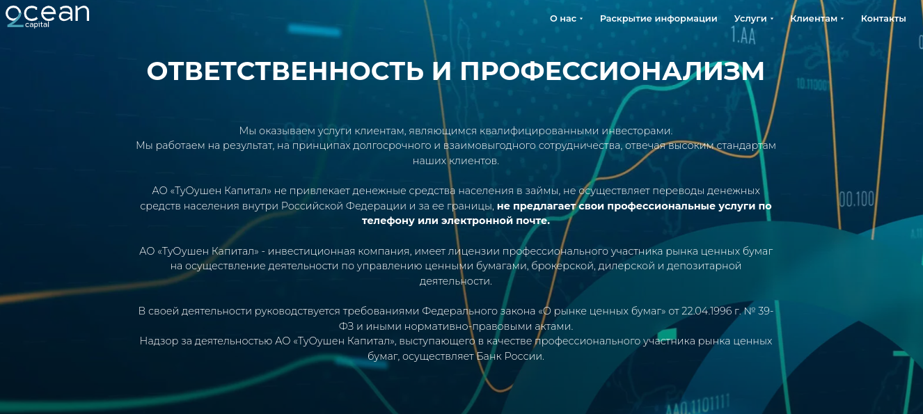 Туоушен капитал — финансовая компания с формой организации акционерного общества АО. Инвестиционный сервис предлагает инструменты, чтобы зарабатывать деньги на рыночных колебания. Профессиональные аналитики и опытные менеджеры сообщают, что услугами могут пользоваться только институциональные инвесторы. После регистрации на сайте платформы пользователи должны прикрепить лицензию аккредитованных финансовых деятелей. Создатели компании по инвестициям 2ocean Capital не демонстрируют настоящую статистику успешных сделок.