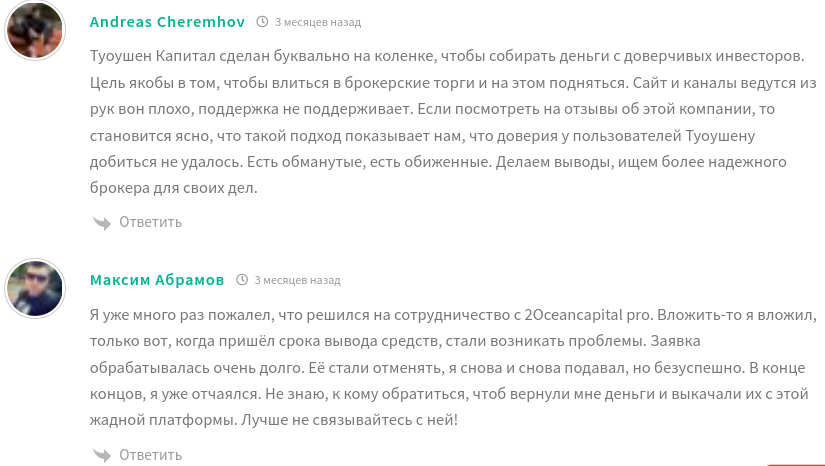 - Отрицательные отзывы об АО «Туоушен капитал», в которых пользователи пишут, что команда проекта мошенники.