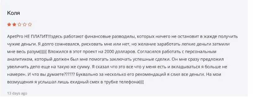 На различных сайтах и форумах отзывы об Апетпро носят настороженный характер. Зачастую юзеры жалуются на то, что проект не платит и является мошенническим. В отдельных откликах говорится, что после пополнения счета связь с менеджерами ухудшается, а попытки вывести средства сопровождаются задержками.