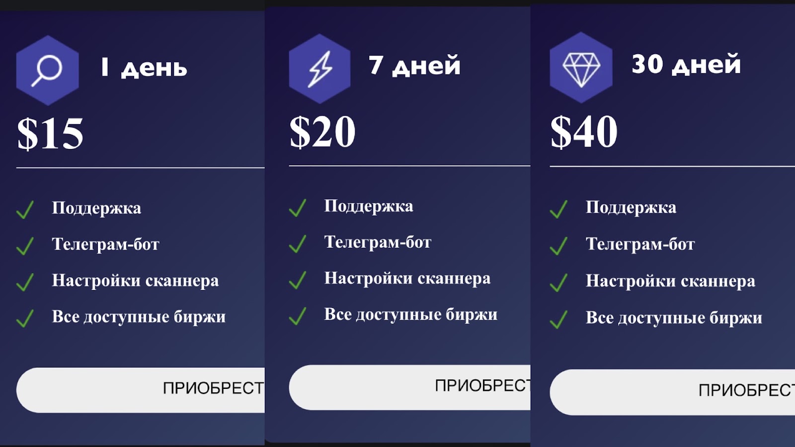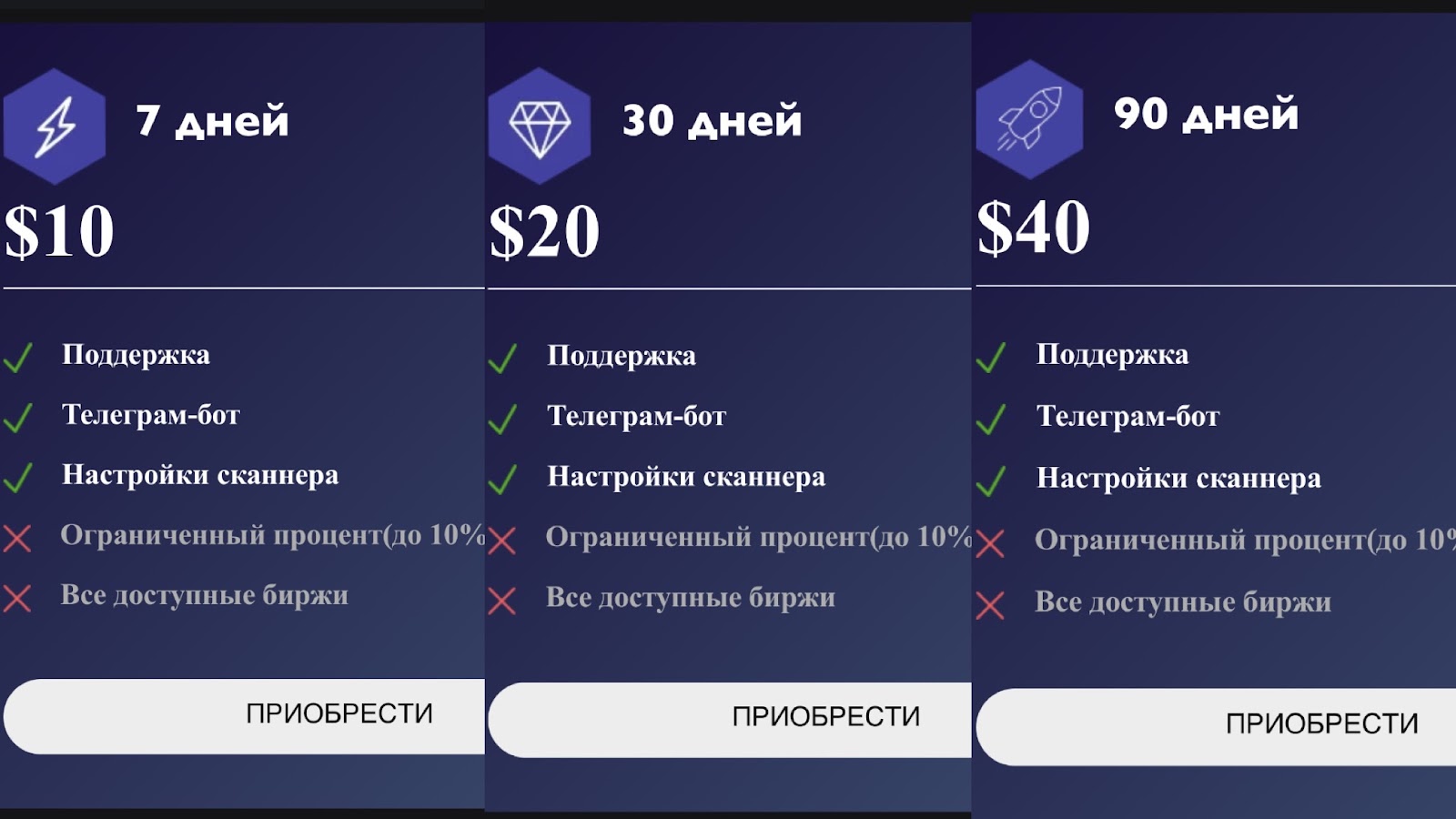 - Basic. Стоимость тарифа — 7$ за один день. В подписку входит: поддержка, телеграмм-бот, настройки сканера, ограниченный процент до 10% и ограниченный выбор бирж;