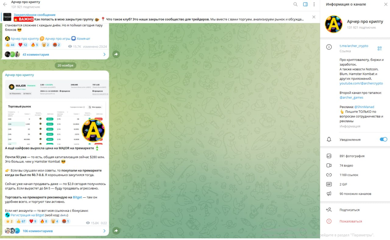 У канала archer crypto, на ноябрь 2024 года, более 130 тысяч подписчиков. Страница была создана в сентябре 2023 года. Активность на канале небольшая. При таком большом количестве подписчиков, посты набирают до 20 тысяч просмотров и 100-200 реакций. Комментарии пишут тоже около сотни человек. Это говорит о том, что нынешний владелец канала приобрел его с уже имеющимися подписчиками или воспользовался накруткой аудитории.