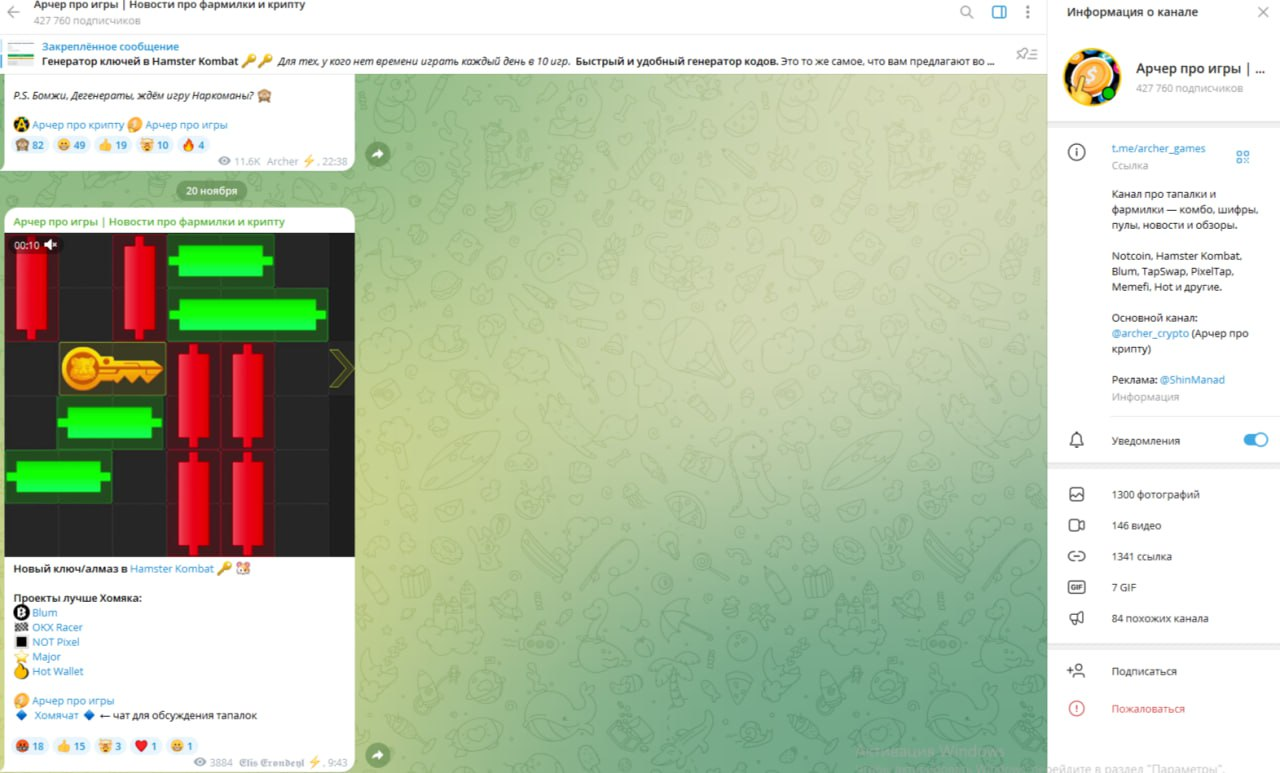 Также есть еще один канал в Телеграмм «Арчер про игры Новости про фармилки и крипту». Он посвящен различным тапалкам, в которых можно зарабатывать криптовалюту. На странице выкладываются ежедневные ключи и коды для игр, а также анонсируются новые проекты. У канала, созданного в июле 2024 года, archer games более 400 тысяч подписчиков на ноябрь 2024.