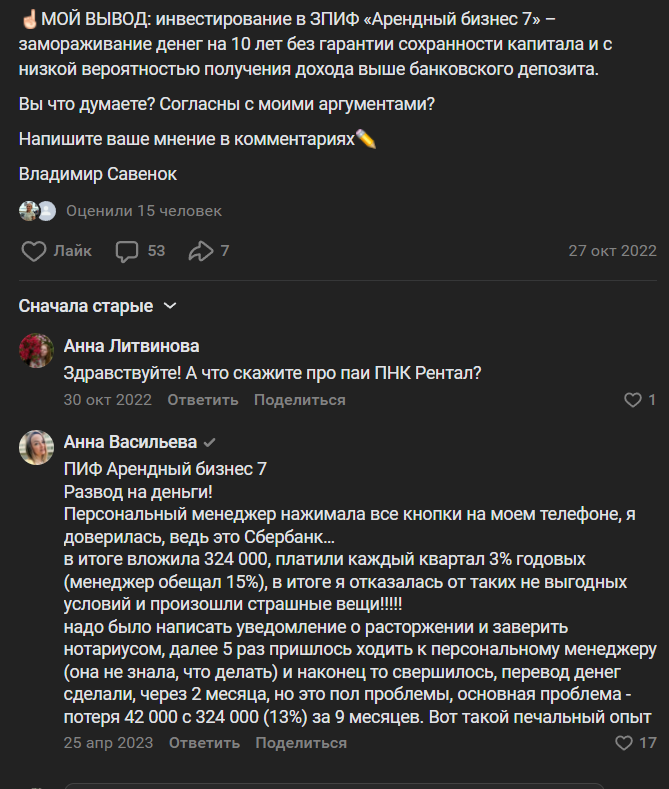 В отрицательных комментариях говорят о том, что смысла инвестировать в фонд нет, так как вряд ли складские помещения в России в ближайшие годы будут иметь повышенный спрос, поэтому риски высокие, а доходность иногда даже ниже банковских вкладов.