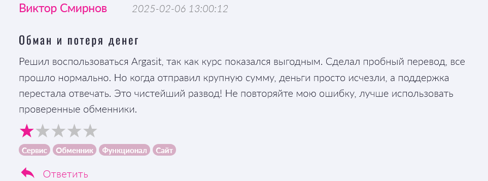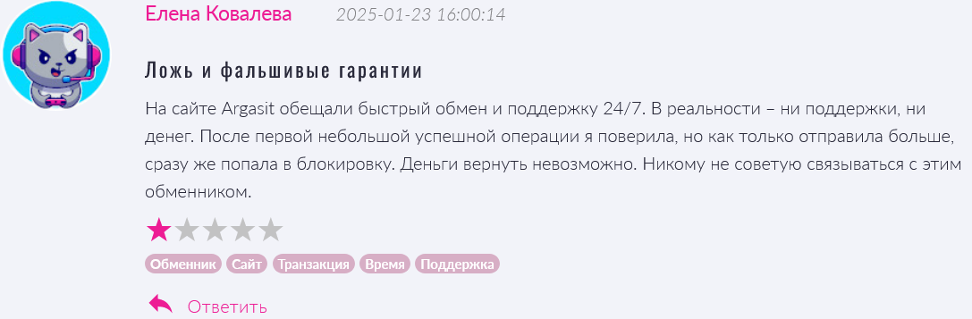 Также в отзывах об обменнике ArgaSit клиенты повествовали о схеме развода. Обмен и вывод небольших сумму проходил без проблем, а крупные суммы выводить не давали.