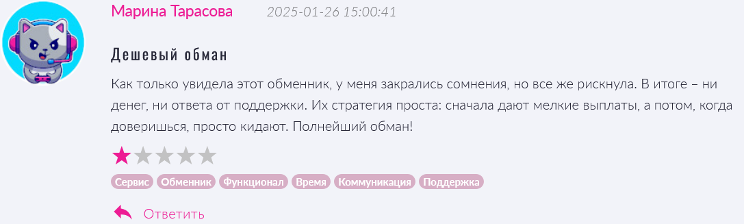 Также пользователи называли обменник фальшивым. Разработчики постоянно меняют адреса, «кидают» клиентов на деньги, потом регистрируются по новому адресу.