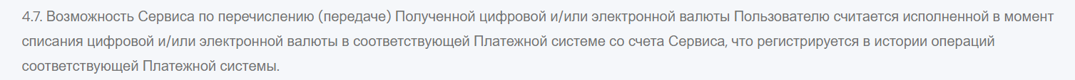 Учитывая непрозрачность процедуры обмена, пункт правил 4.7 выглядит как отказ от ответственности, так как клиент не имеет возможности проверить действительно ли средства были списаны со счета обменника или информация является фейковой.