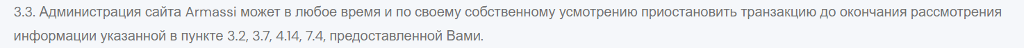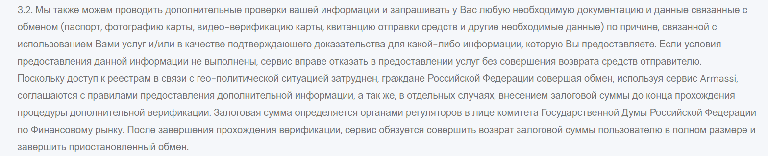 В разделе «Правила» компания указывает на то, что она вправе потребовать документы подтверждающие легальное происхождение средств для обмена, а также залоговую сумму на время совершения перевода через Armassi. Период проверки не ограничен, что наводит на мысли о возможной безвозвратной заморозке ваших средств под предлогом проверки.