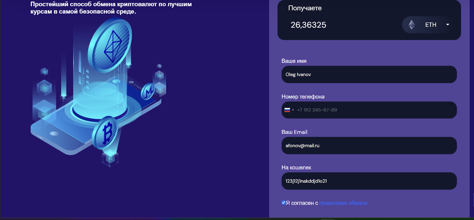 Процедура обмена простая. Достаточно ввести свое имя, номером мобильного телефона, электронную почту и указать кошелек для зачисления перевода. Данные никто не проверяет, а в поле «кошелек» можно ввести любые значения.