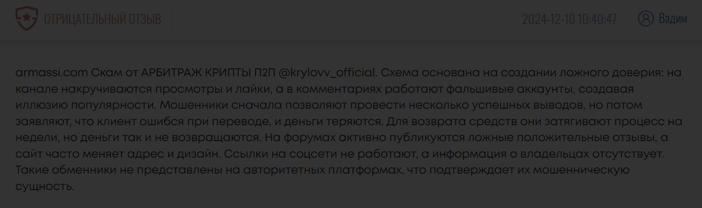 - В сети только один отрицательный отзыв об Armassi com работе с проектом, что не позволяет оценить реальную репутацию проекта.